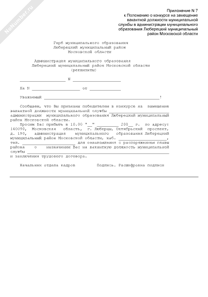 Сообщение о назначении на должность в администрации города Люберцы Московской области (рекомендуемый образец заполнения)