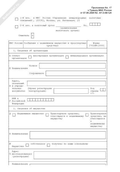 Сообщение о недвижимом имуществе и транспортных средствах. Форма № 2302ИМ(2000)