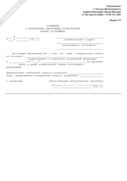 Сообщение о непризнании выигравшей котировочной заявки поставщика на поставку закупаемой продукции для нужд лечебно-профилактических учреждений и структурных подразделений Департамента здравоохранения города Москвы (форма № 10)