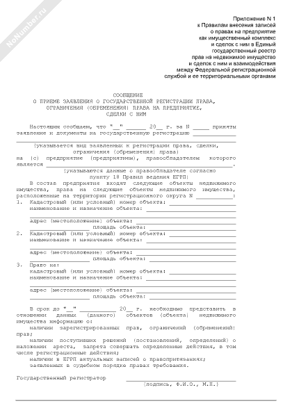 Сообщение о приеме заявления о государственной регистрации права, ограничения (обременения) права на предприятие, сделки с ним