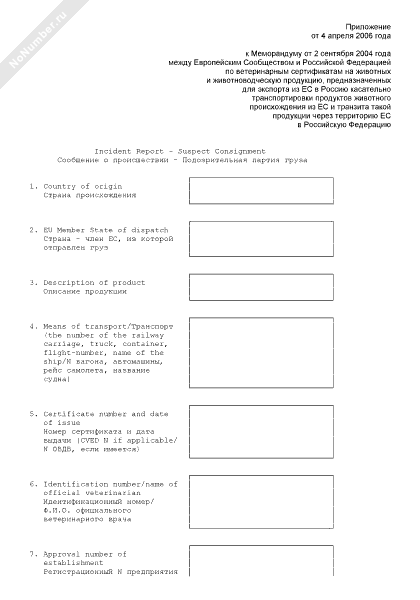Сообщение о происшествии — подозрительная партия груза, предназначенного для экспорта из Европейского Союза в Россию касательно транспортировки продуктов животного происхождения (рекомендуемый образец заполнения)