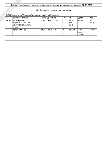 Сообщение о проведении открытого аукциона (рекомендуемый образец заполнения)