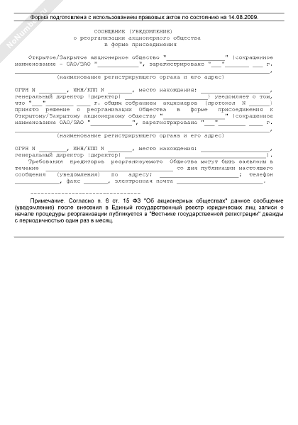 Сообщение (уведомление) о реорганизации акционерного общества в форме присоединения