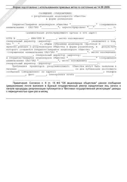 Сообщение (уведомление) о реорганизации акционерного общества в форме разделения