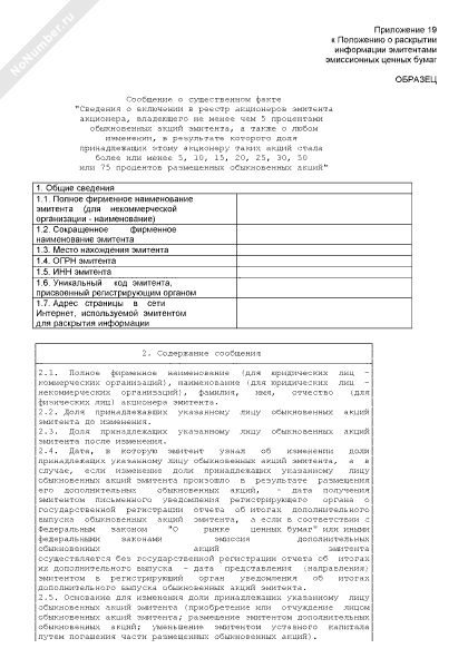 Сообщение о существенном факте «Сведения о включении в реестр акционеров эмитента акционера, владеющего не менее чем 5 процентами обыкновенных акций эмитента, а также о любом изменении, в результате которого доля принадлежащих этому акционеру таких акций стала более или менее 5, 10, 15, 20, 25, 30, 50 или 75 процентов размещенных обыкновенных акций» (рекомендуемый образец заполнения)