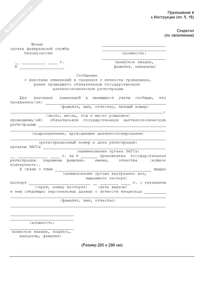 Сообщение о внесении изменений в сведения о личности гражданина, ранее прошедшего обязательную государственную дактилоскопическую регистрацию в органах федеральной безопасности (рекомендуемый образец заполнения)