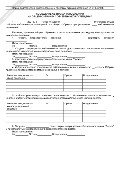Сообщение об итогах голосования на общем собрании собственников помещений (рекомендуемый образец заполнения)