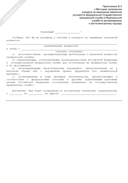 Сообщение об отказе в допуске к участию в конкурсе на замещение вакантной должности государственной гражданской службы в Федеральной службе по ветеринарному и фитосанитарному надзору (рекомендуемый образец заполнения)