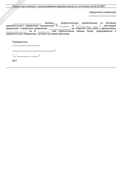 Сообщение об открытии счета депо в депозитарии для перечисления ценных бумаг, передаваемых в доверительное управление (приложение к договору доверительного управления имуществом)