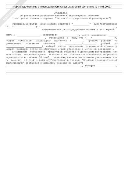 Сообщение об уменьшении уставного капитала акционерного общества (для органа печати — журнала «Вестник государственной регистрации»)