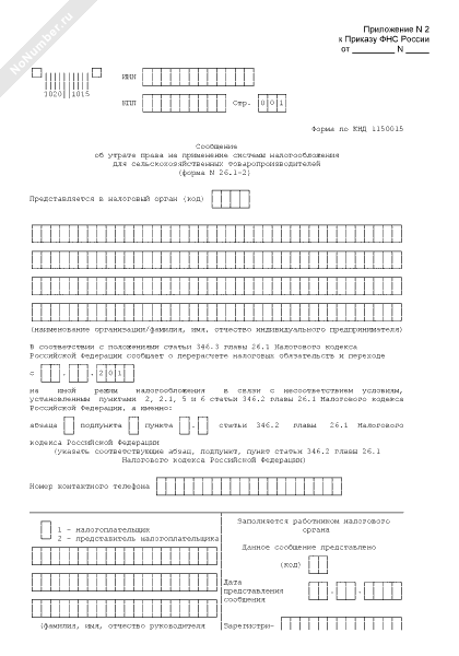 Сообщение об утрате права на применение системы налогообложения для сельскохозяйственных товаропроизводителей. Форма № 26.1-2 (рекомендуемый образец заполнения)