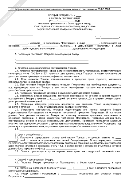 Спецификация к договору поставки товара с отсрочкой оплаты товара (передача товара производится с борта судна в порту)