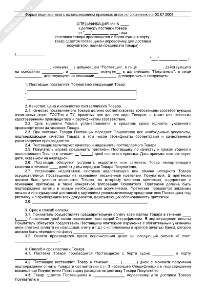 Спецификация к договору поставки товара с полной предоплатой товара (передача товара производится с борта судна в порту)
