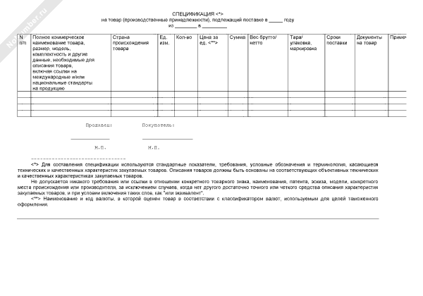 Спецификация на товар (приложение к типовому договору поставки товара)