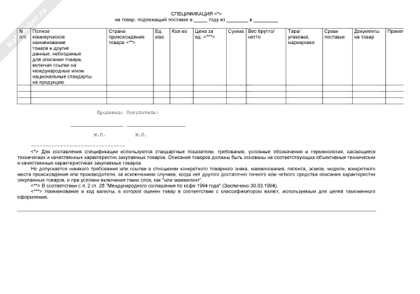 Спецификация на товар (приложение к типовому договору поставки товара)
