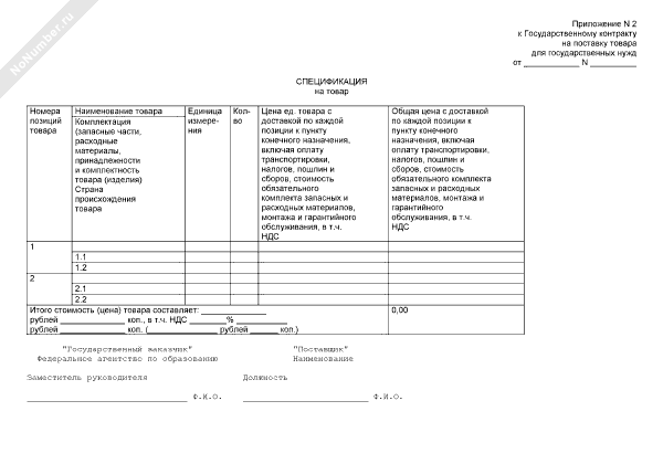 Спецификация на товар (приложение к государственному контракту на поставку товара для государственных нужд)