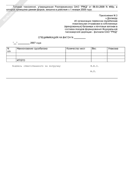 Спецификация на вагон (приложение к договору об организации перевозки грузобагажа повагонными отправками в собственных (арендованных) багажных и почтовых вагонах в составах поездов формирования федеральной пассажирской дирекции — филиала ОАО «РЖД»)
