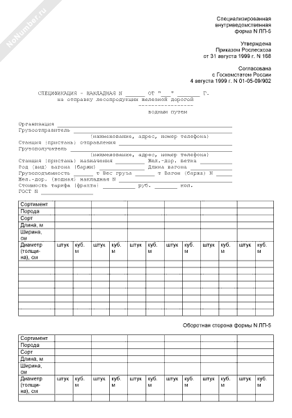 Спецификация-накладная на отправку лесопродукции железной дорогой (водным путем). Специализированная внутриведомственная форма № ЛП-5