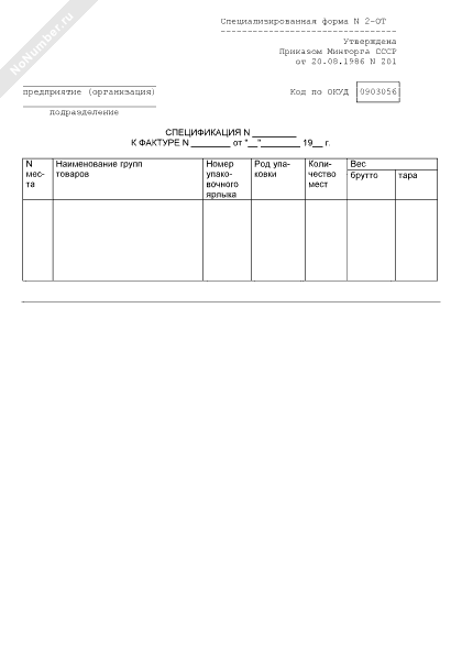 Спецификация к фактуре. Специализированная форма № 2-ОТ