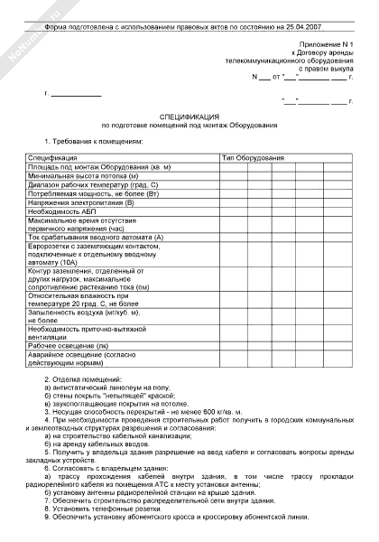 Спецификация по подготовке помещений под монтаж оборудования (приложение к договору аренды телекоммуникационного оборудования с правом выкупа)