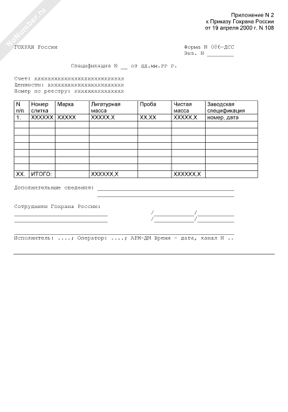Спецификация ценностей. Форма № 006-ДСС