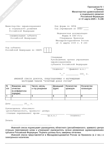 - 9Именной список доноров, представляемых к награждению нагрудным знаком «Почетный донор России». Форма № 446-05/у