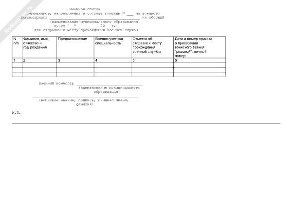 - 17Именной список граждан, призванных на военную службу и отправляемых воинской командой со сборного пункта субъекта Российской Федерации военного округа в распоряжение начальника пункта приема пополнения (командира воинской части) со станции железной дороги (аэропорта, порта)