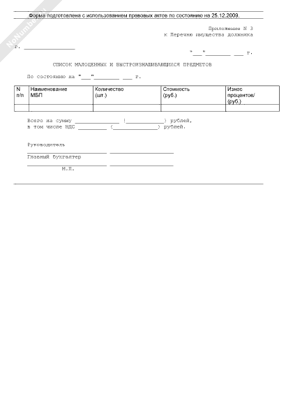 - 322Список малоценных и быстроизнашивающихся предметов (приложение к перечню имущества должника, в том числе имущественных прав)
