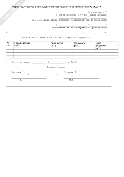 - 323Список малоценных и быстроизнашивающихся предметов, находящихся на балансе, с указанием начисленного износа (приложение к передаточному акту при присоединении некоммерческой организации к некоммерческой организации)