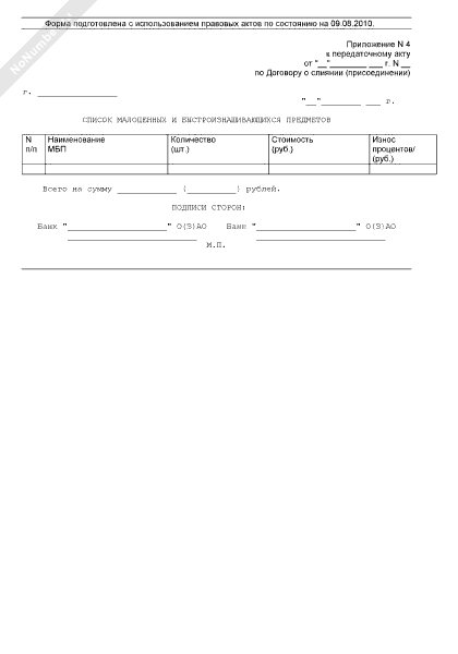 - 324Список малоценных и быстроизнашивающихся предметов (приложение к передаточному акту по договору о слиянии (присоединении) банков (небанковских кредитных организаций) акционерных обществ)