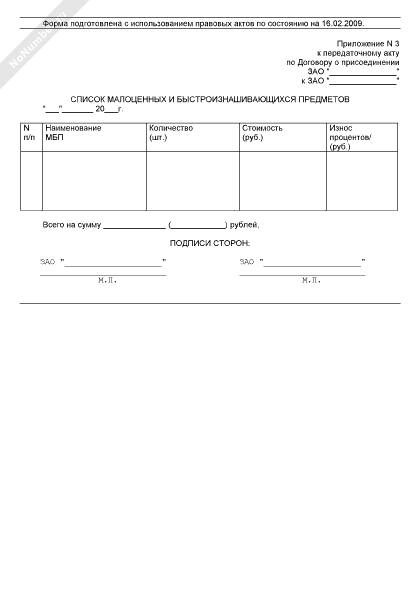 - 321Список малоценных и быстроизнашивающихся предметов (приложение к передаточному акту по договору о присоединении закрытого акционерного общества к закрытому акционерному обществу)