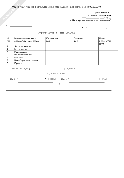 - 325Список материальных запасов (приложение к передаточному акту по договору о слиянии (присоединении) банков (небанковских кредитных организаций) акционерных обществ)