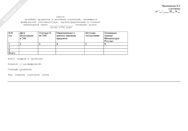 - 336Список музейных предметов и музейных коллекций, являющихся федеральной собственностью, зарегистрированных в главной инвентарной книге музея после 1996 года (приложение к договору о передаче в безвозмездное бессрочное пользование или пользование на определенный срок музейных предметов и музейных коллекций, входящих в состав государственной части Музейного фонда Российской Федерации и находящихся в федеральной собственности)