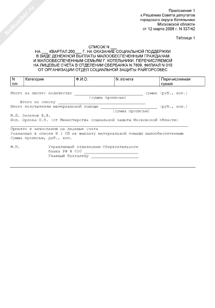 - 347Список на оказание социальной поддержки в виде денежной выплаты малообеспеченным гражданам и малообеспеченным семьям г. Котельники Московской области, перечисляемой на лицевые счета в отделении Сбербанка № 7809, филиал № 010 от организации отдел социальной защиты райгорсобес