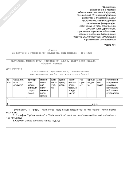 - 348Список на получение спортивного имущества спортсменам и тренерам для участия в спортивных соревнованиях, показательных выступлениях, учебно-тренировочных сборах (форма № 4)