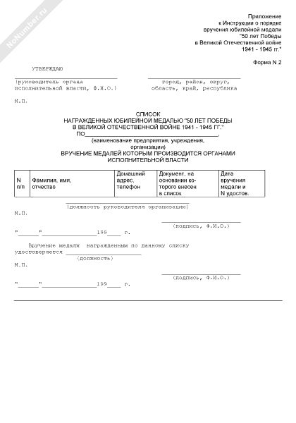 - 356Список награжденных юбилейной медалью «50 лет победы в Великой Отечественной войне 1941-1945 гг.», вручение медалей которым производится органами исполнительной власти (форма № 2)