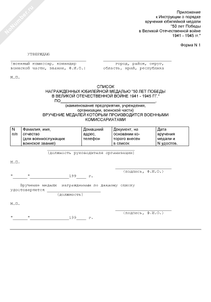 - 355Список награжденных юбилейной медалью «50 лет победы в Великой Отечественной войне 1941-1945 гг.», вручение медалей которым производится военными комиссариатами (форма № 1)