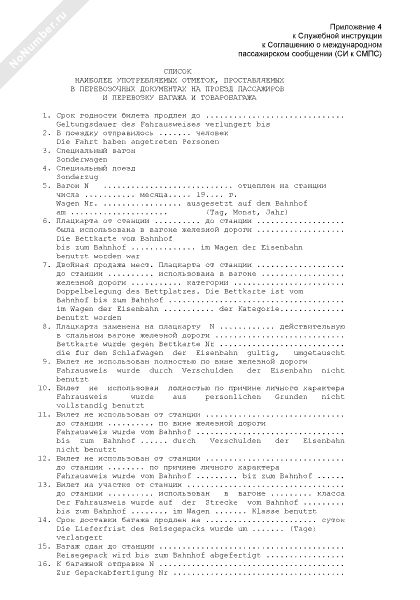 - 359Список наиболее употребляемых отметок, проставляемых в перевозочных документах на проезд пассажиров и перевозку багажа и товаробагажа (международное пассажирское сообщение) (рус./нем.)