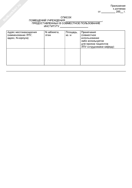 - 431Список помещений учреждения, предоставленных в совместное пользование институту (приложение к типовому договору между лечебно-профилактическим учреждением и медицинскими образовательными и научно-исследовательскими институтами (академиями, учебными центрами) по использованию медицинского учреждения в качестве клинической базы)
