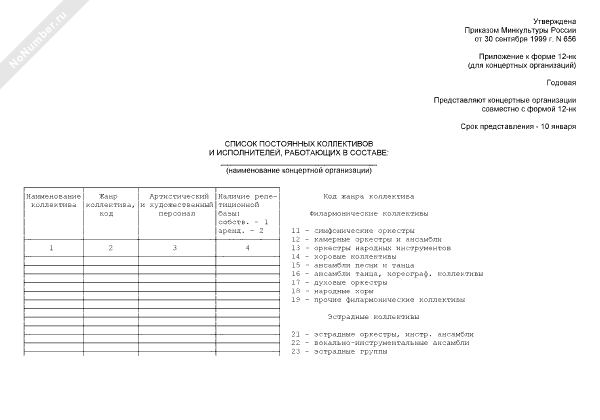 - 433Список постоянных коллективов и исполнителей (приложение к форме № 12-НК (для концертных организаций))