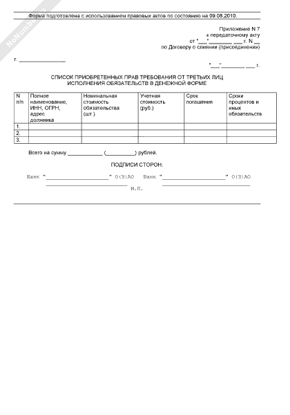 - 443Список приобретенных прав требования от третьих лиц исполнения обязательств в денежной форме (приложение к передаточному акту по договору о слиянии (присоединении) банков (небанковских кредитных организаций) акционерных обществ)