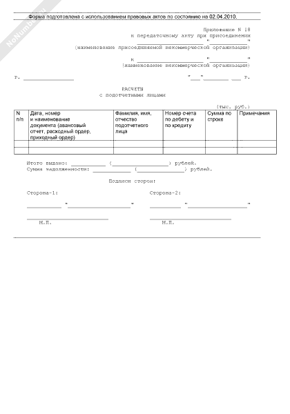 - 445Список проведенных расчетов с подотчетными лицами (приложение к передаточному акту при присоединении некоммерческой организации к некоммерческой организации)