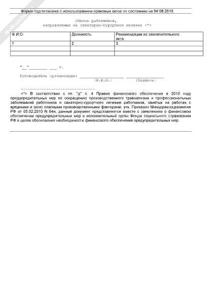 - 457Список работников, направляемых на санаторно-курортное лечение, с указанием рекомендаций, содержащихся в заключительном акте