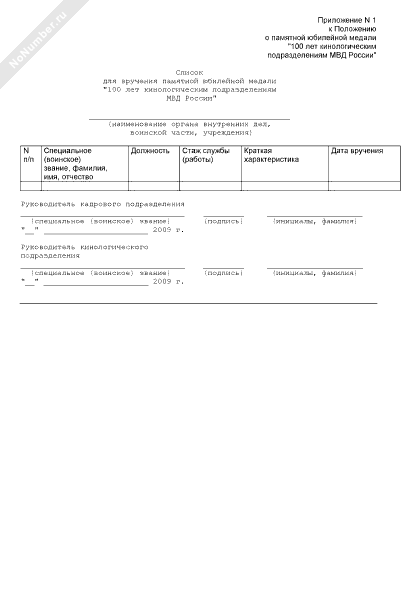 Список для вручения памятной юбилейной медали «100 лет кинологическим подразделениям МВД России» (рекомендуемый образец заполнения)