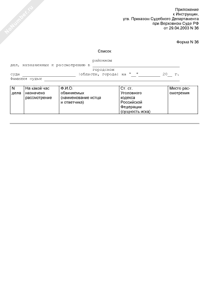 Список дел, направленных для рассмотрения в суде. Форма № 36
