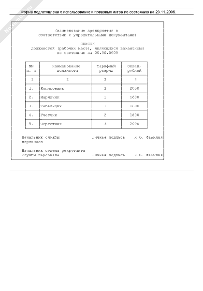 Список должностей (рабочих мест), являющихся вакантными