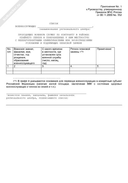 Список военнослужащих, проходящих военную службу по контракту в районах Крайнего Севера и приравненных к ним местностях с неблагоприятными климатическими или экологическими условиями и подлежащих плановой замене (рекомендуемый образец заполнения)