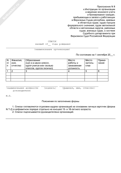 Список юношей, подлежащих первоначальной постановке на воинский учет в следующем году (рекомендуемый образец заполнения)