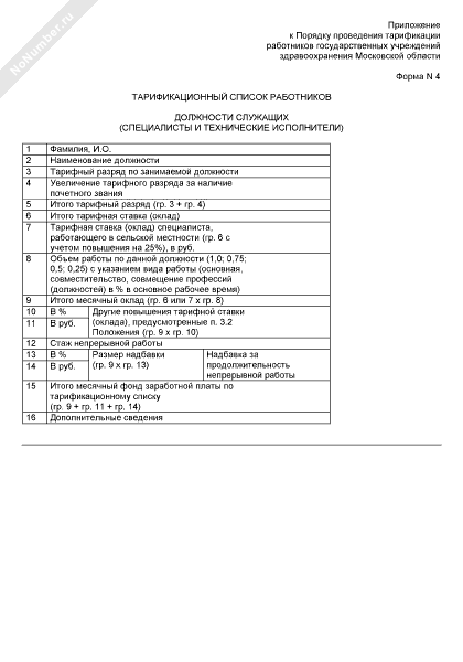 Тарификационный список работников. Должности служащих (специалисты и технические исполнители) (форма № 4)