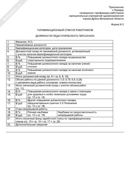 Тарификационный список работников муниципальных учреждений здравоохранения города Дубны Московской области. Должности педагогического персонала (форма № 3)